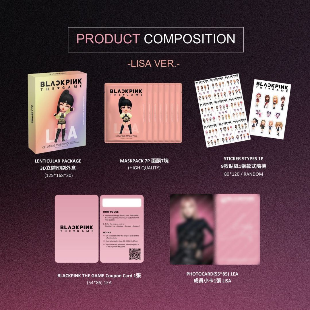 Each box contains MASKPACK 7P, PHOTOCARD 1P, STICKER 9TYPES 1P(RANDOM), and BLACKPINK THE GAME COUPON CARD 1P(Worth KRW$10,000)
