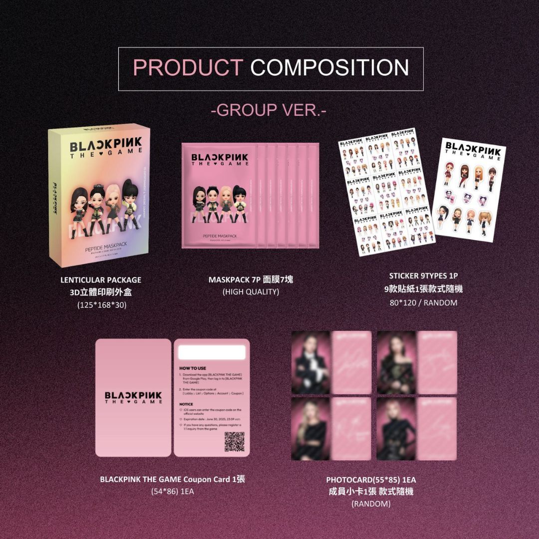 每盒含面膜7片、成員小卡1張、9款貼紙隨機1張與BLACKPINK THE GAME 遊戲道具序號卡