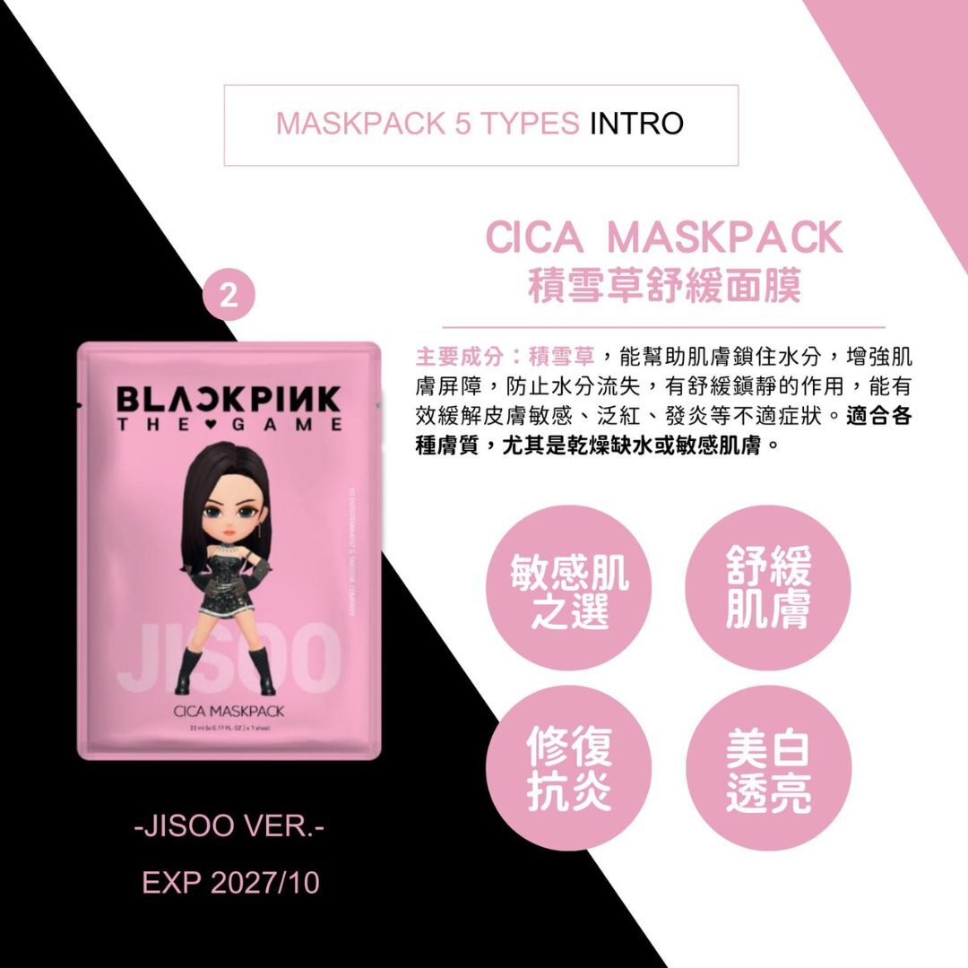 每盒含面膜7片、JISOO 小卡1張、9款貼紙隨機1張與BLACKPINK THE GAME 遊戲道具序號卡