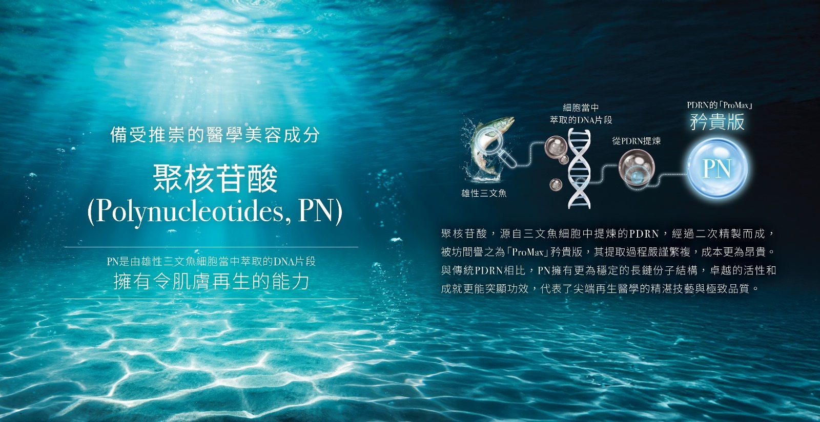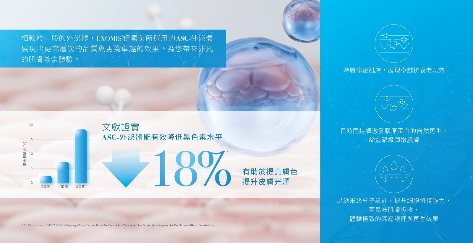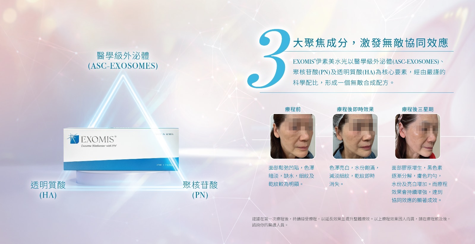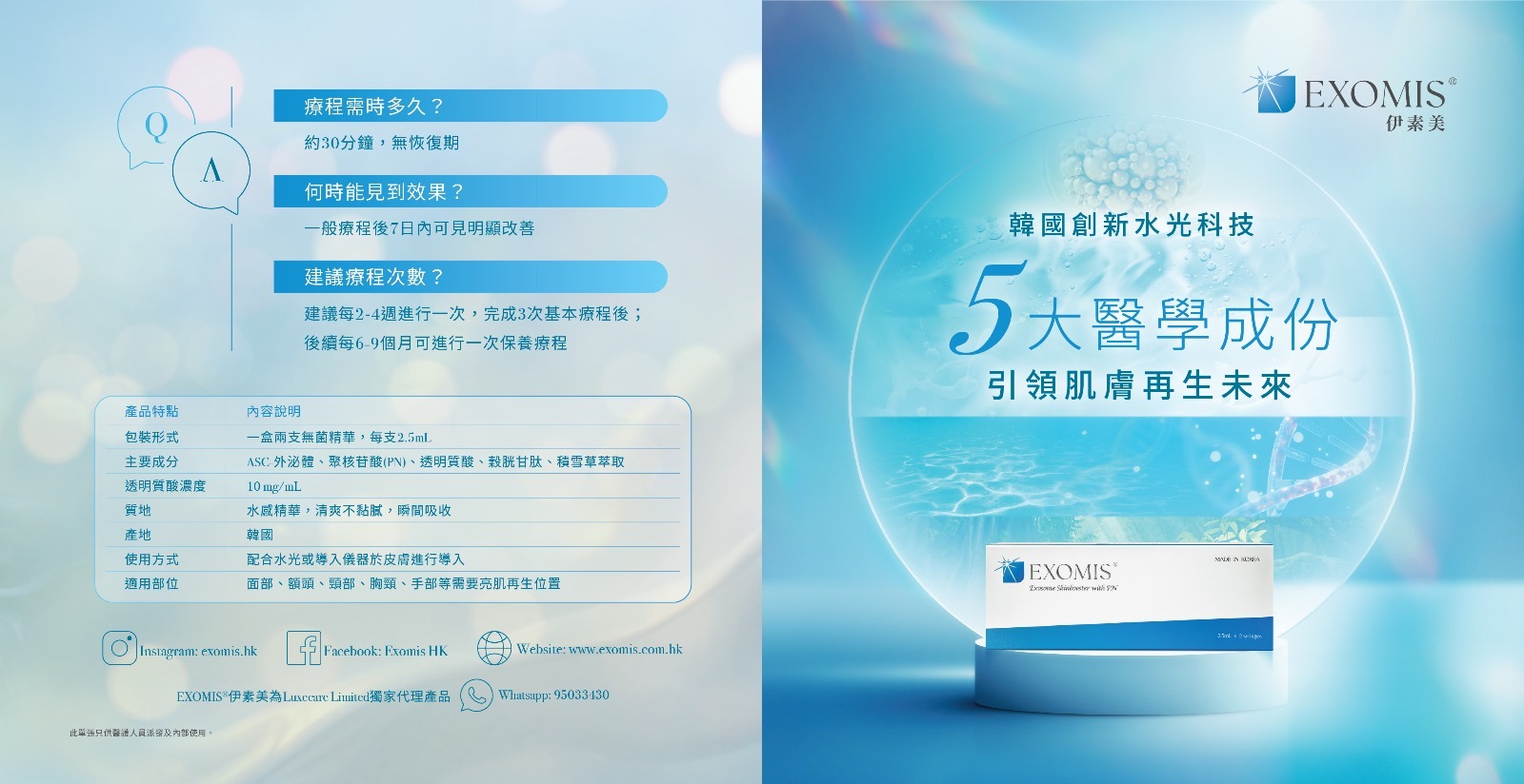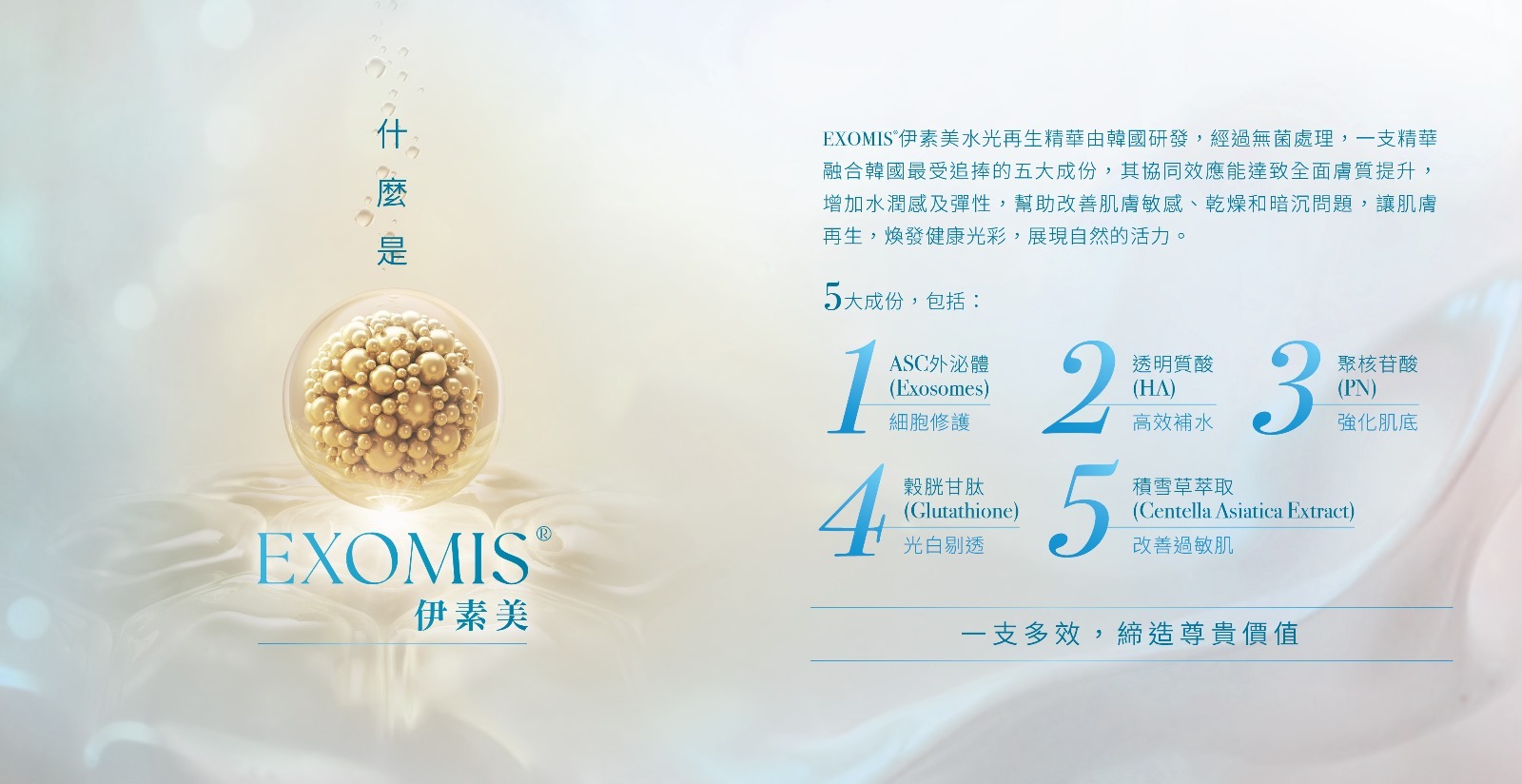 由韓國研發,經過無菌處理,每支蘊含高濃度醫學級ASC外泌體、聚核苷酸(PN)、透明質酸、穀胱甘肽及積雪草萃取。成分相互協同作用,能幫助強化肌底結構、激活膠原蛋白生成、紓緩泛紅敏感,同時為肌膚注入深層水份,展現剔透光澤。適合乾燥、暗啞、鬆弛、泛紅或有細紋的肌膚,能於短時間內帶來改善,並透過療程持續保養,維持年輕狀態。
